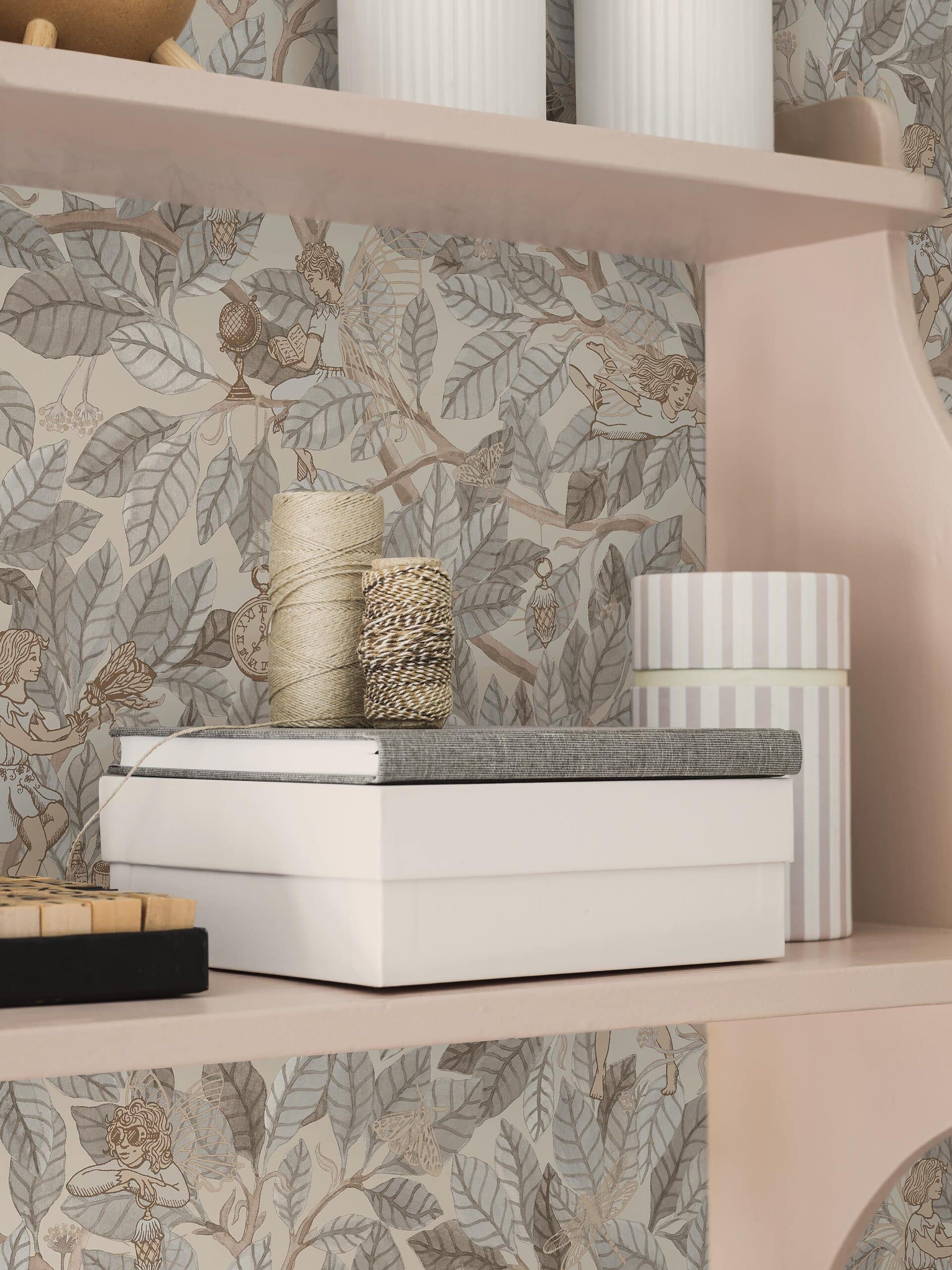 Den ljuvliga barntapeten Fairies pryds av ett tätt slingrande bladverk med skimrande detaljer i guld, ett ljuvligt mönster som är handmålat i akvarell. Här bor söta små älvor, trollsländor och nattfjärilar – en rofylld men också lekfull tapet för barnrummet.Här går tapeten Fairies sagolika mönster i en ljust gråbeige färgskala på ljusgrå botten.